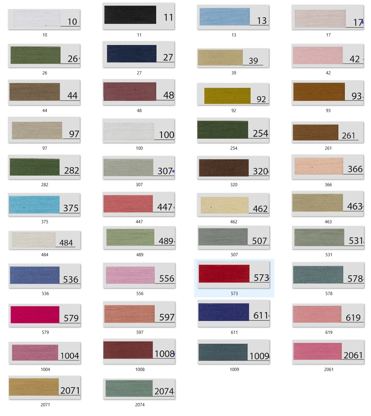 | Cor | 1004, 1008, 1009, 2071, 2074, 26, 27, 282, 296, 307, 366, 42, 447, 454, 462, 48, 489, 490, 491, 531, 578, 597, 619, 93, 97, Azul 0536, Azul 13, Azul Tifany 375, Bege 44, Bege 463, Cinza 507, Marinho 611, Marrom 320, Off wite 100, Pink 579, Rosa 0556, Rosa 2061, Vermelho 573, Bege 39, bege 484, Branca, marrom 261, Preto |