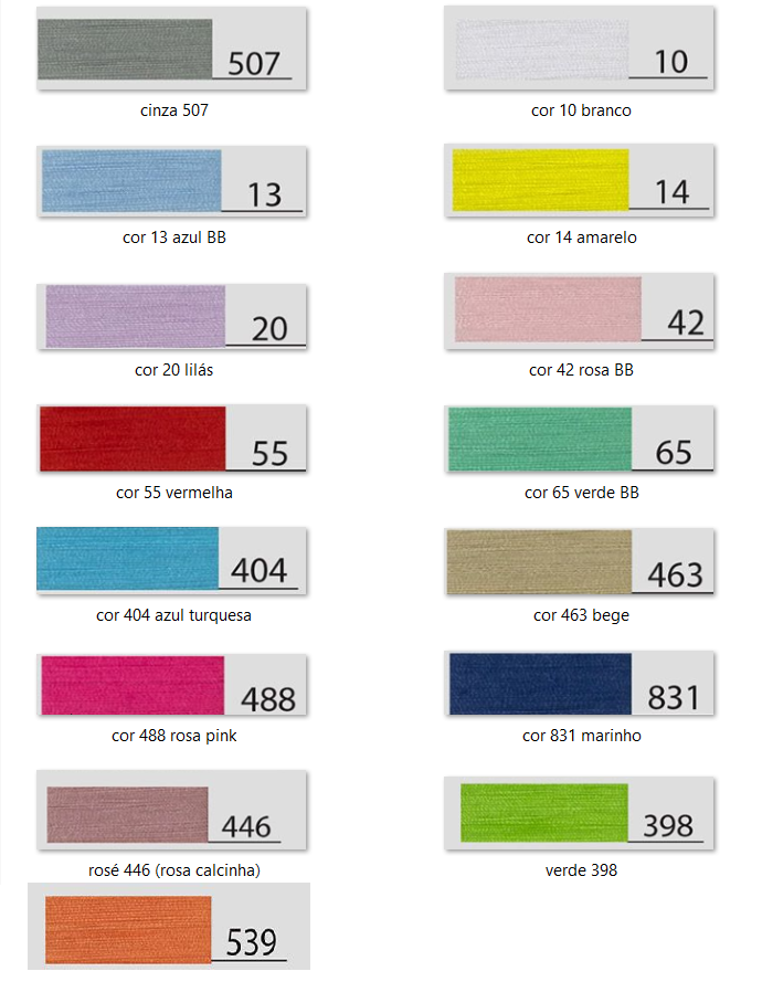 | Cor | Cinza 507, Branca, cor 13 azul BB, cor 14 amarelo, cor 20 lilás, cor 404 azul turquesa, cor 42 rosa BB, cor 463 bege, cor 488 rosa pink, cor 539 salmão/laranja, cor 55 vermelho, cor 65 verde BB, cor 831 marinho, Rosê calcinha 446, Verde 398 |