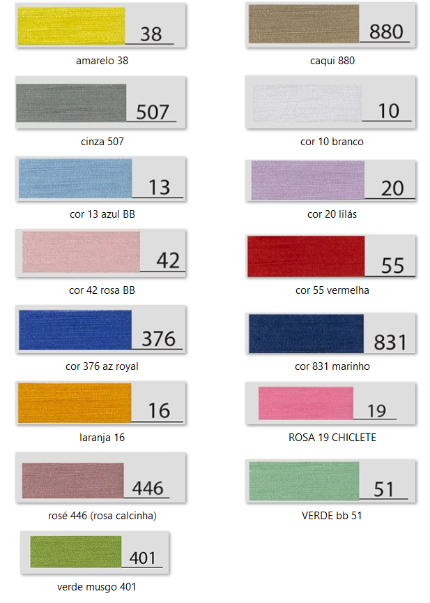 | Cor | Azul 13, Branco, Cinza 507, amarelo 38, Azul BB 15, Azul Royal 376, Caqui 880, Cinza/Prata 75, Laranja 16, Lilás 20, Marinho 831, Militar/Oliva 26, Rosa 19, Rosa BB 42, Rosê calcinha 446, Verde BB 51, verde musgo 401, Verde Safari 76, Vermelho 55 |